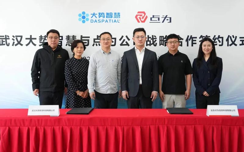 武漢大(dà)勢智慧CTO張帆、北(běi)京分(fēn)公司總經理(lǐ)艾興榮、北(běi)京分(fēn)公司營銷總監李鑫宇與點為(wèi)公司副總裁馬騰飛(fēi)、副總裁助理(€lǐ)陳曲、VR技(jì)術(shù)總監金(jīn)鼎出席儀式,共同見(jiàn)證簽約。