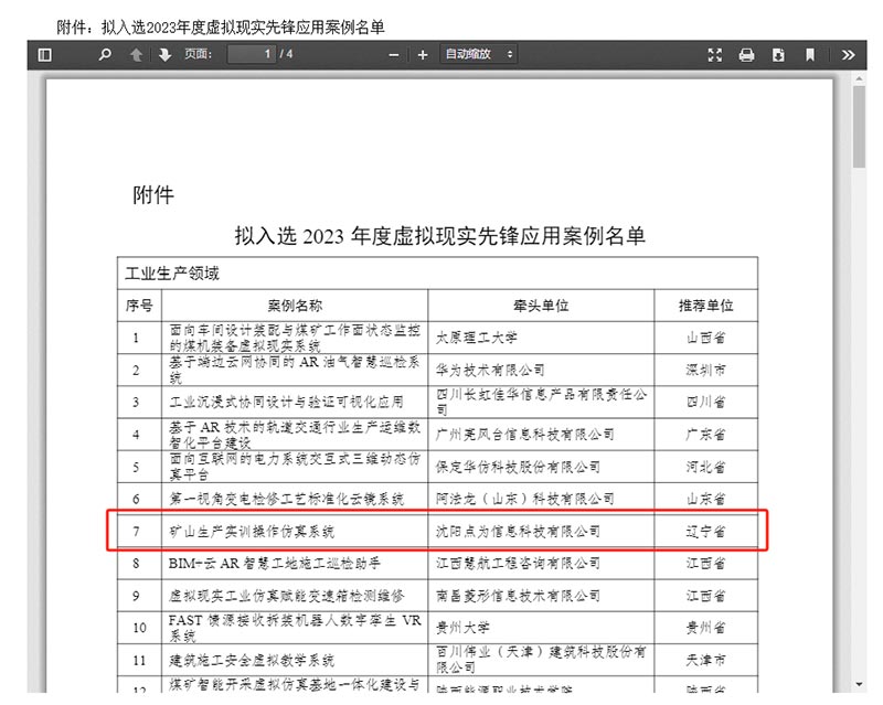 其中,由北京圖趣寶信息科技有限公司沈陽技(jì)術(shù)研發中心(沈陽點為(wèi)信息科(kē)技(jì)有↕(yǒu)限公司)申報(bào)的(de) “礦山(shān)生(shēng)産實訓操作(zuò)仿真系統” 案例成功入選!